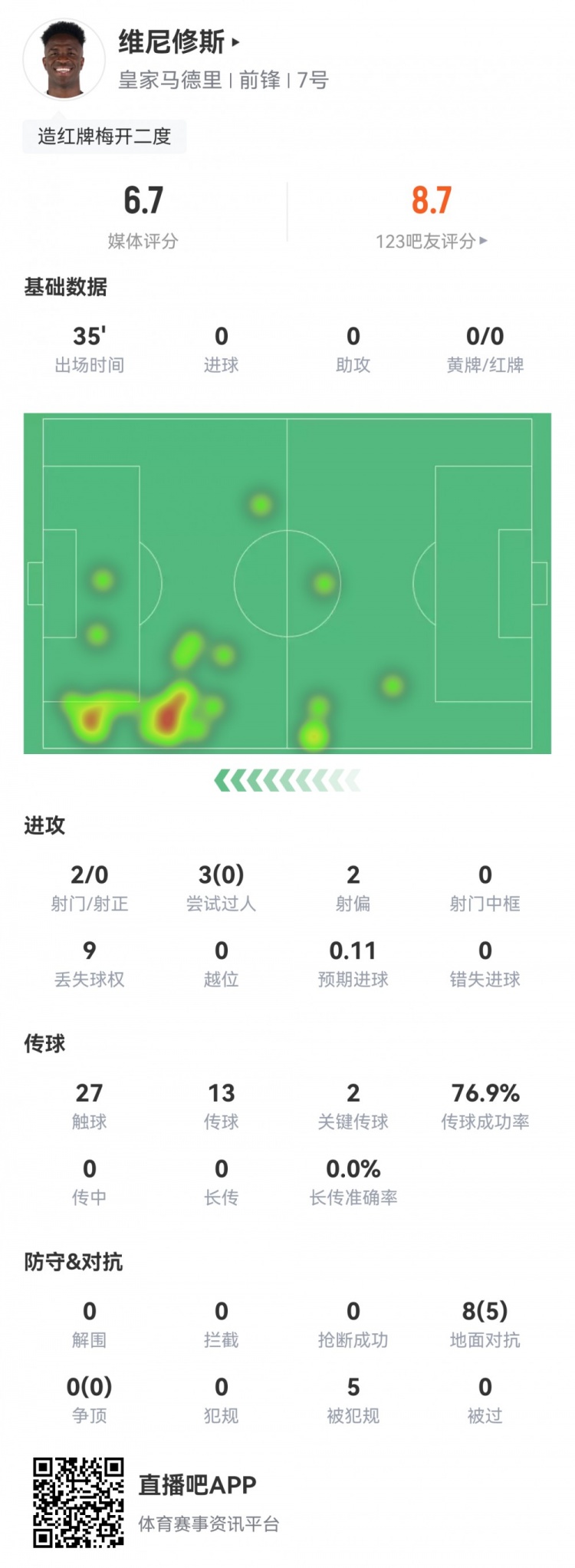 Thống kê của Vinicius: Cầu thủ vào thay người bị phạm lỗi 5 lần và nhận 2 thẻ đỏ trong 35 phút, đồng thời có 2 đường chuyền then chốt đạt chỉ số 6,7